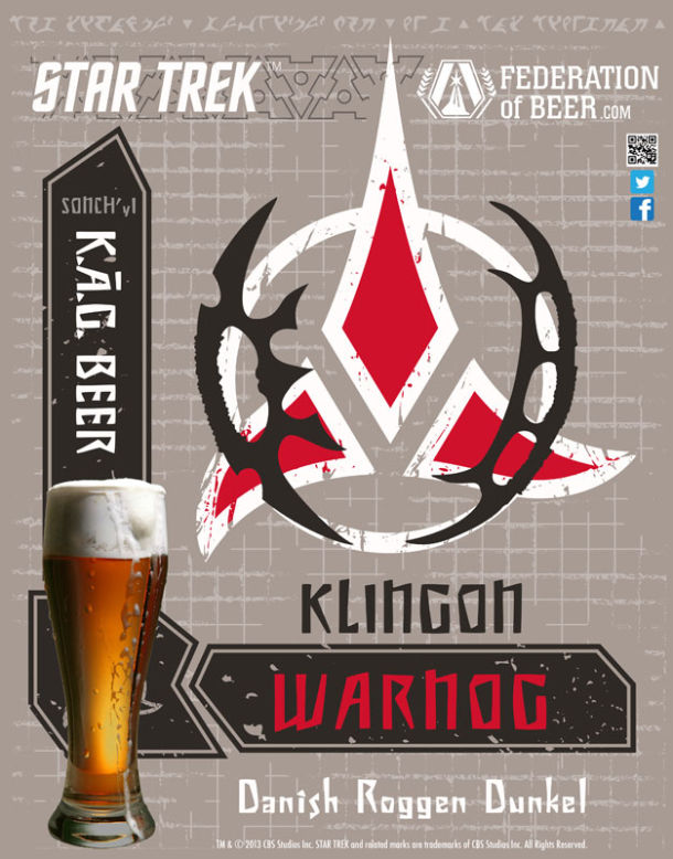 This is old news, but only this evening did I get a good look at the label: http://4.bp.blogspot.com/-HzVQddjRRzs/UzGRHdkn9KI/AAAAAAAAYwQ/svlnWhM40Is/s1600/Federation+of+Beer+Klingon+Warnog+can+design.jpg